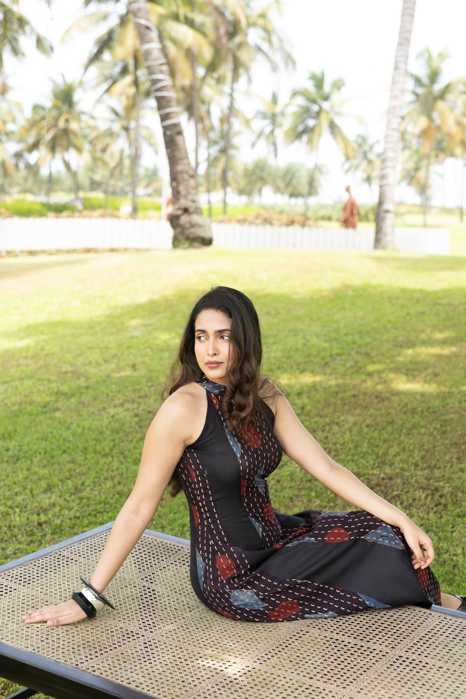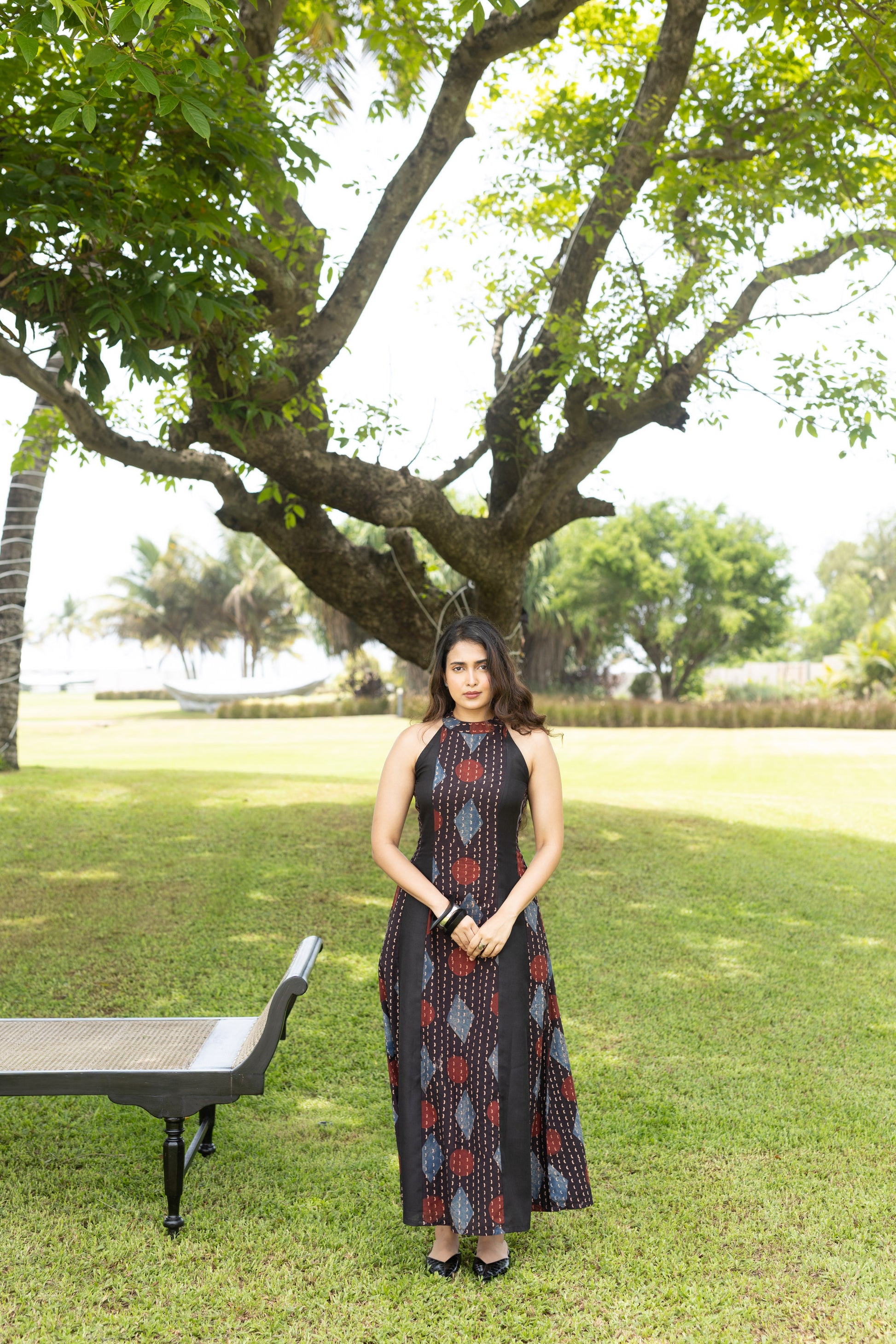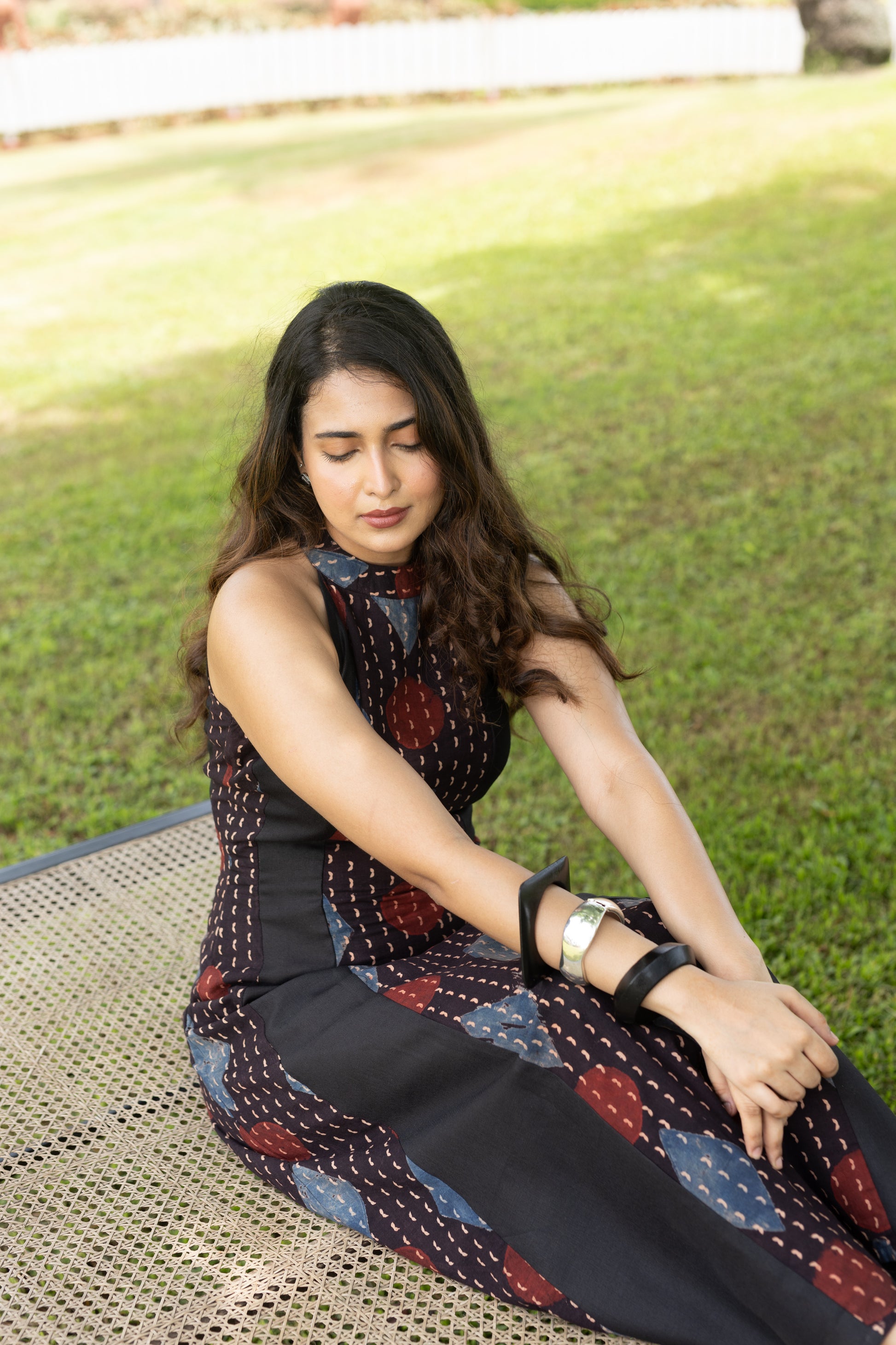 Dustscript is a soft-spoken tribute to Ajrak — the centuries-old craft of resist block printing known for its symmetry, earthy dyes, and soulful geometry. Rendered in pure cotton, this halter-neck dress flows full-length, adorned with hand-printed motifs in shades of rust, charcoal, and deep indigo. The fabric bears the subtle irregularities of handmade work — each block a whisper, each print a line in a longer poem.