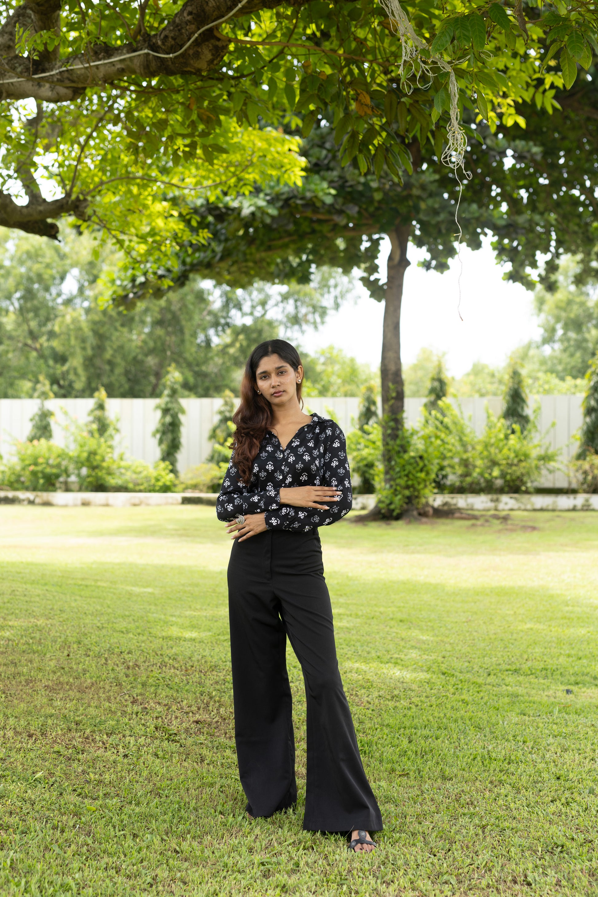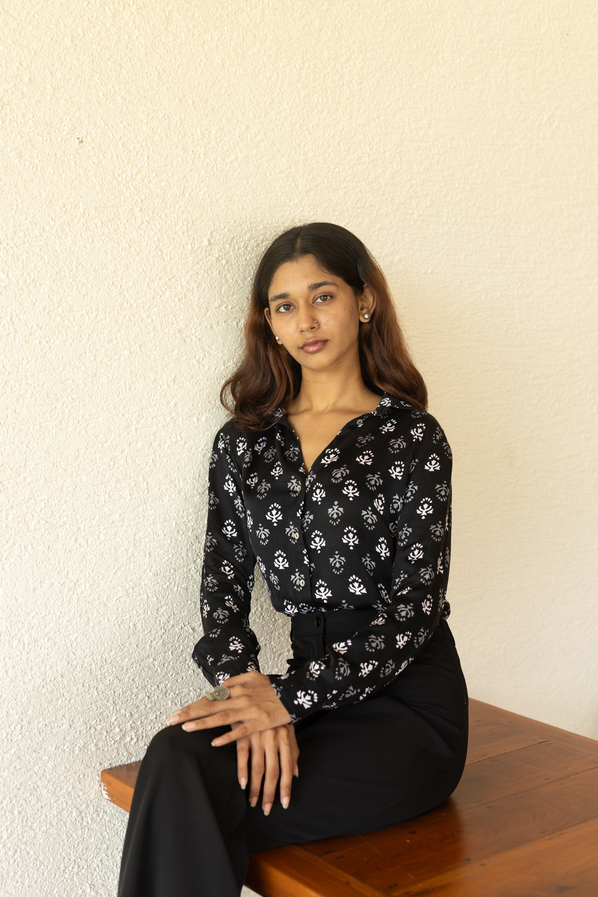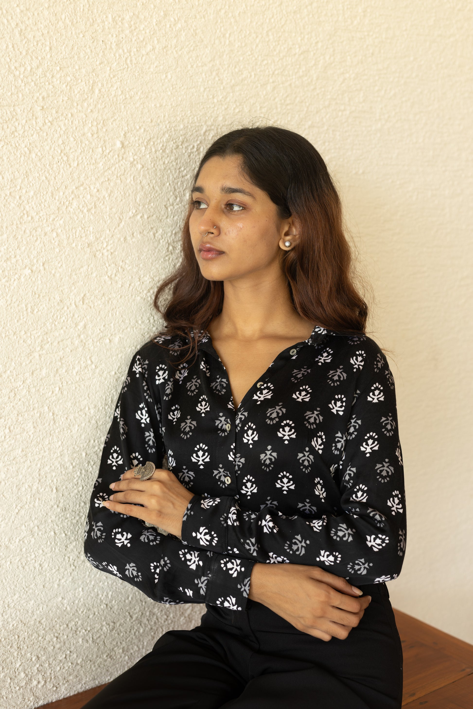A quiet force of elegance, Élan Noire is for the woman who commands presence without raising her voice. Tailored in a fluid modal silk, this jet-black shirt is brought to life with hand block-printed white floral butis — timeless and minimal, like brushstrokes on fine parchment.
