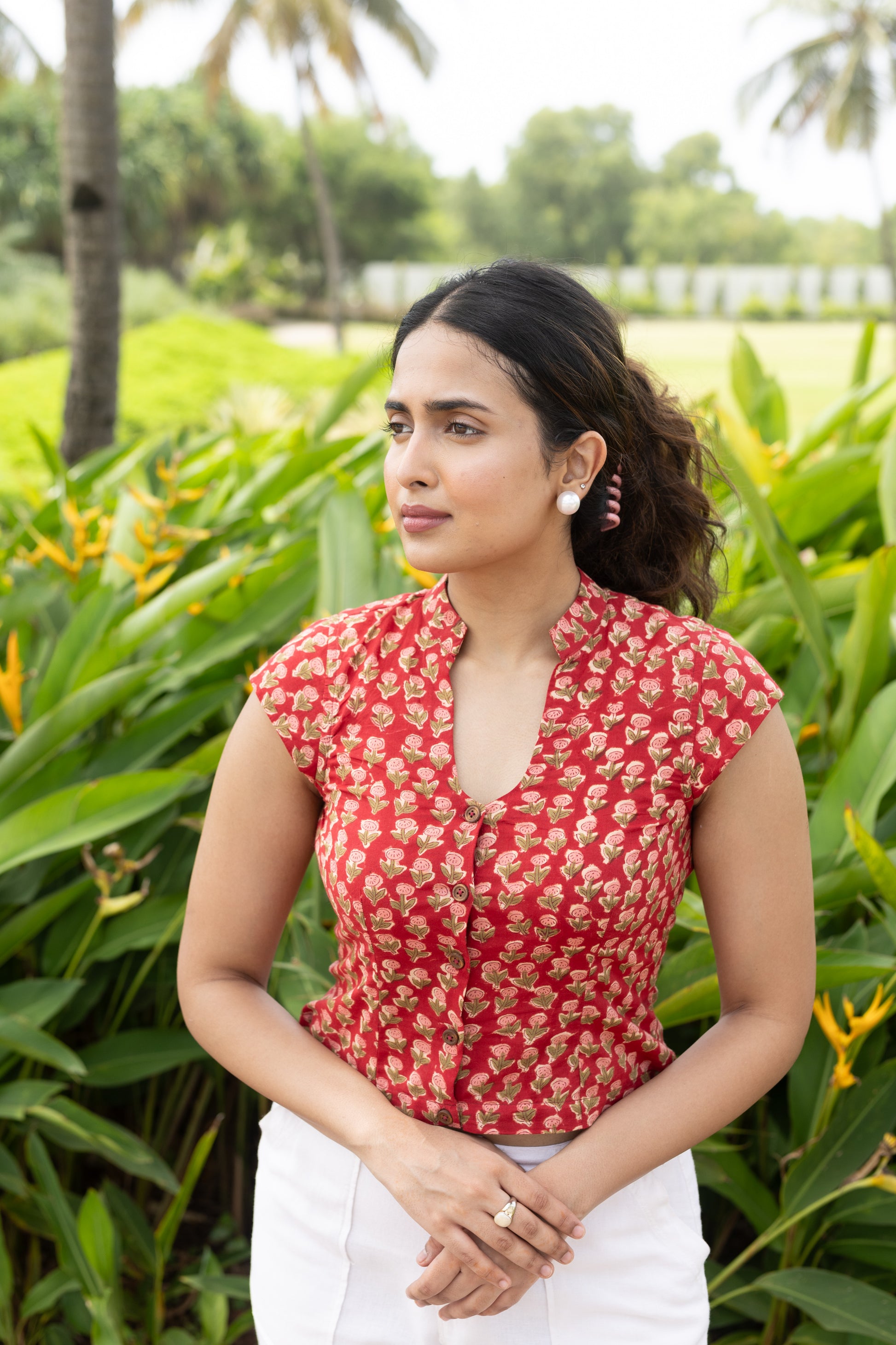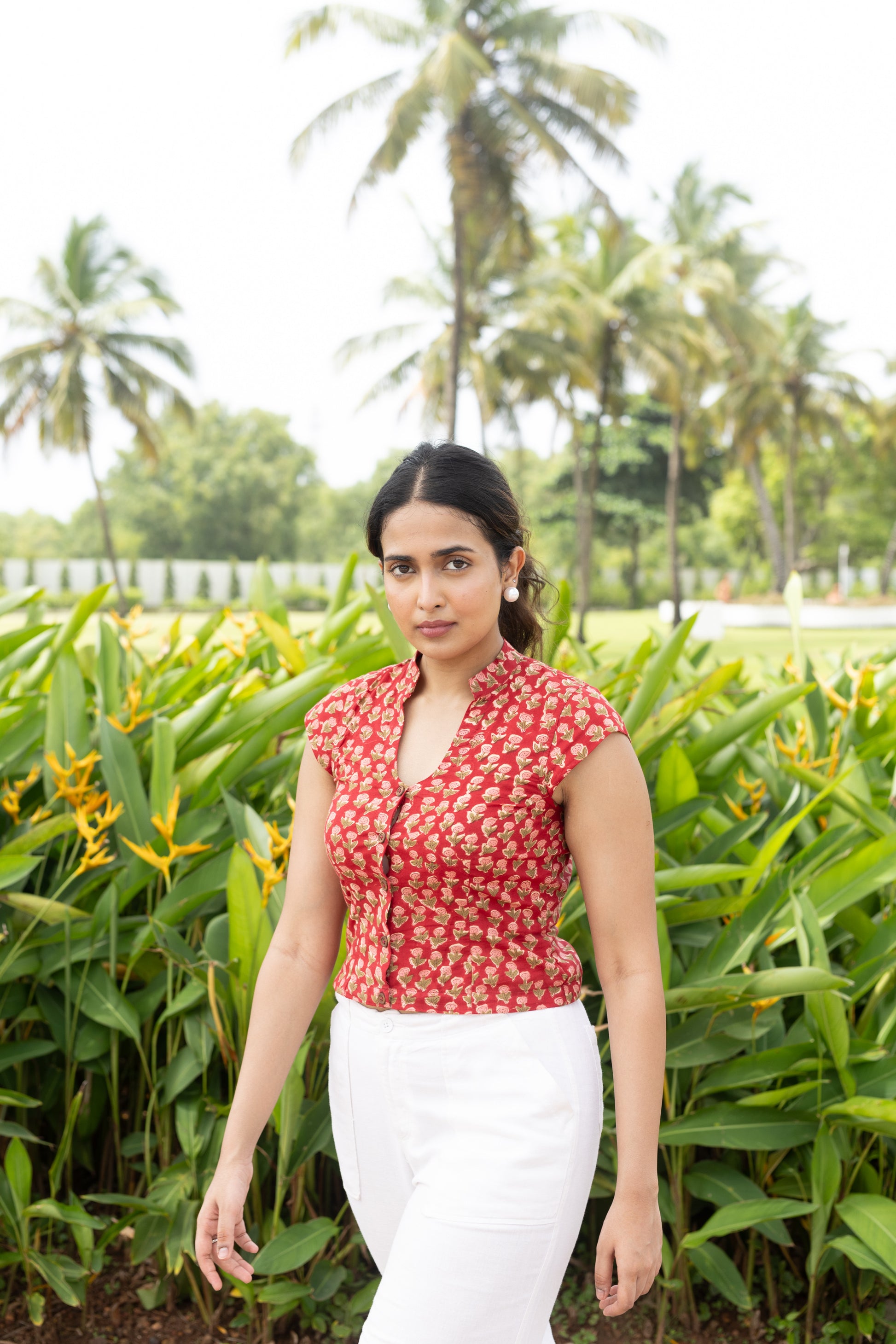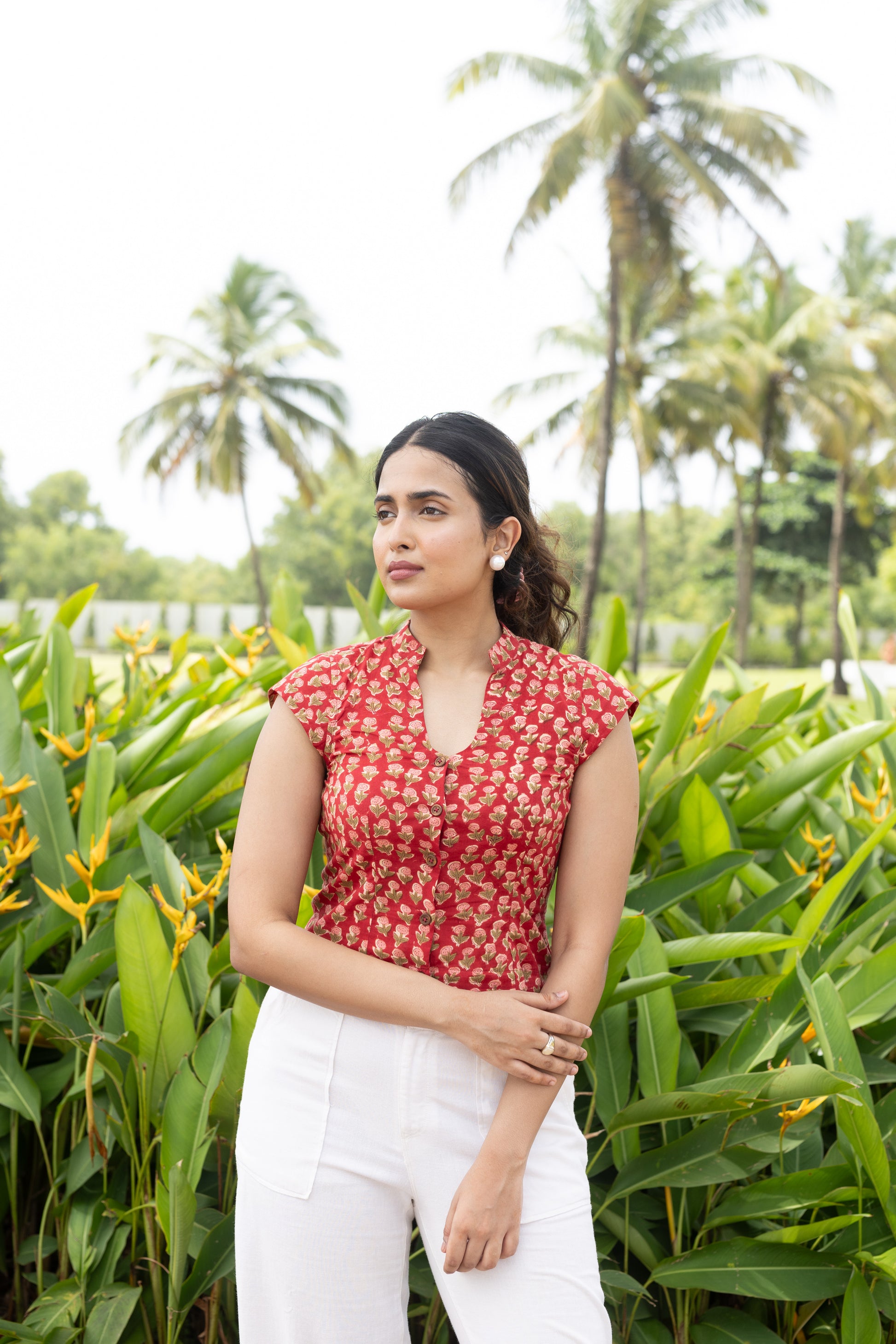 A timeless silhouette meets eco-conscious detailing in this tailored cap-sleeve blouse, crafted from soft, breathable 100% cotton. The vibrant crimson base is adorned with hand block-inspired florals, creating a print that feels both rooted and radiant. Thoughtfully finished with hand-carved wooden buttons, this piece reflects a deeper commitment to sustainable fashion. The cap sleeves offer ease and movement, while the breathable cotton keeps you cool in warm weather. Designed for modern women who value both craft and comfort, this blouse transitions beautifully from laid-back brunches to semi-formal gatherings.