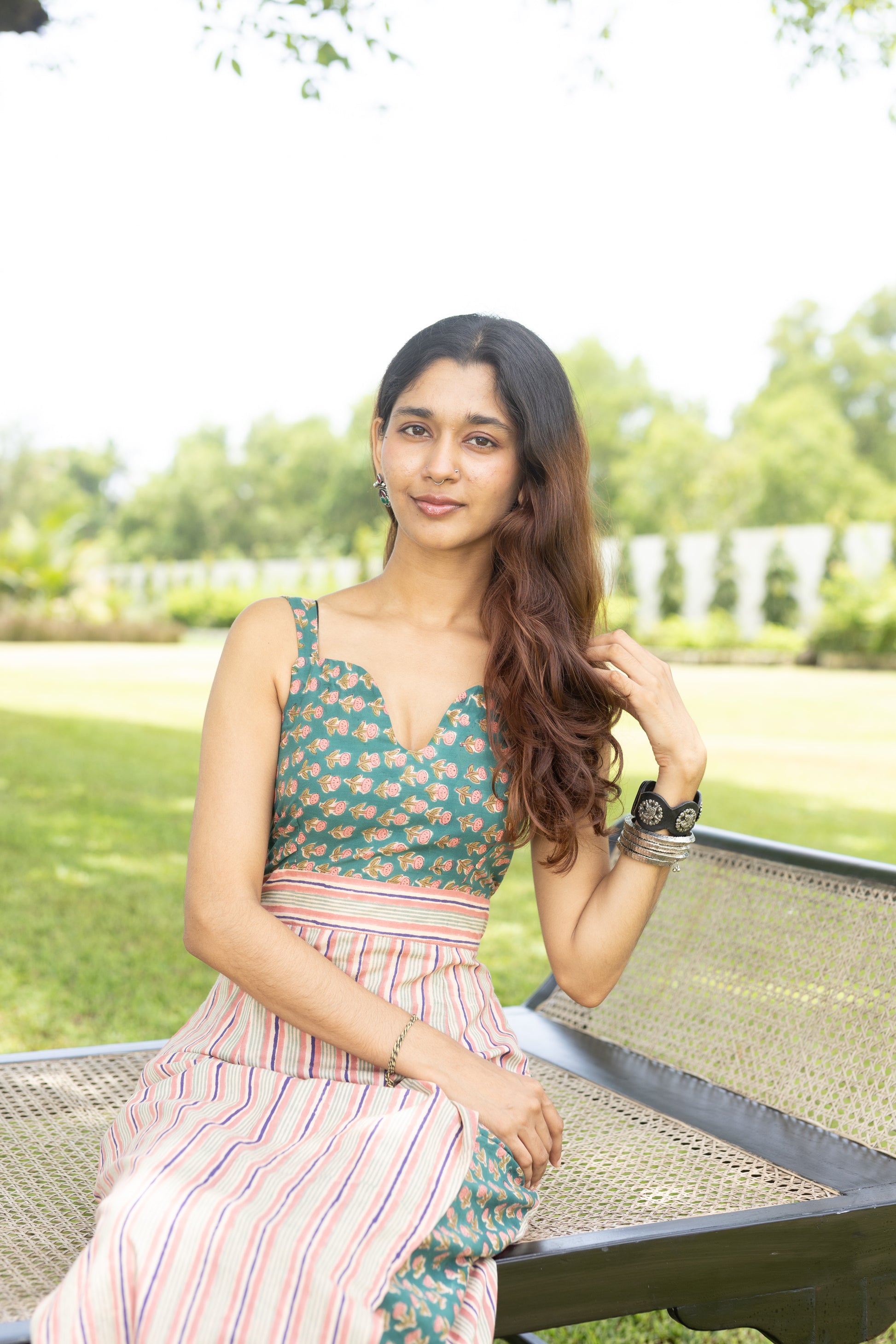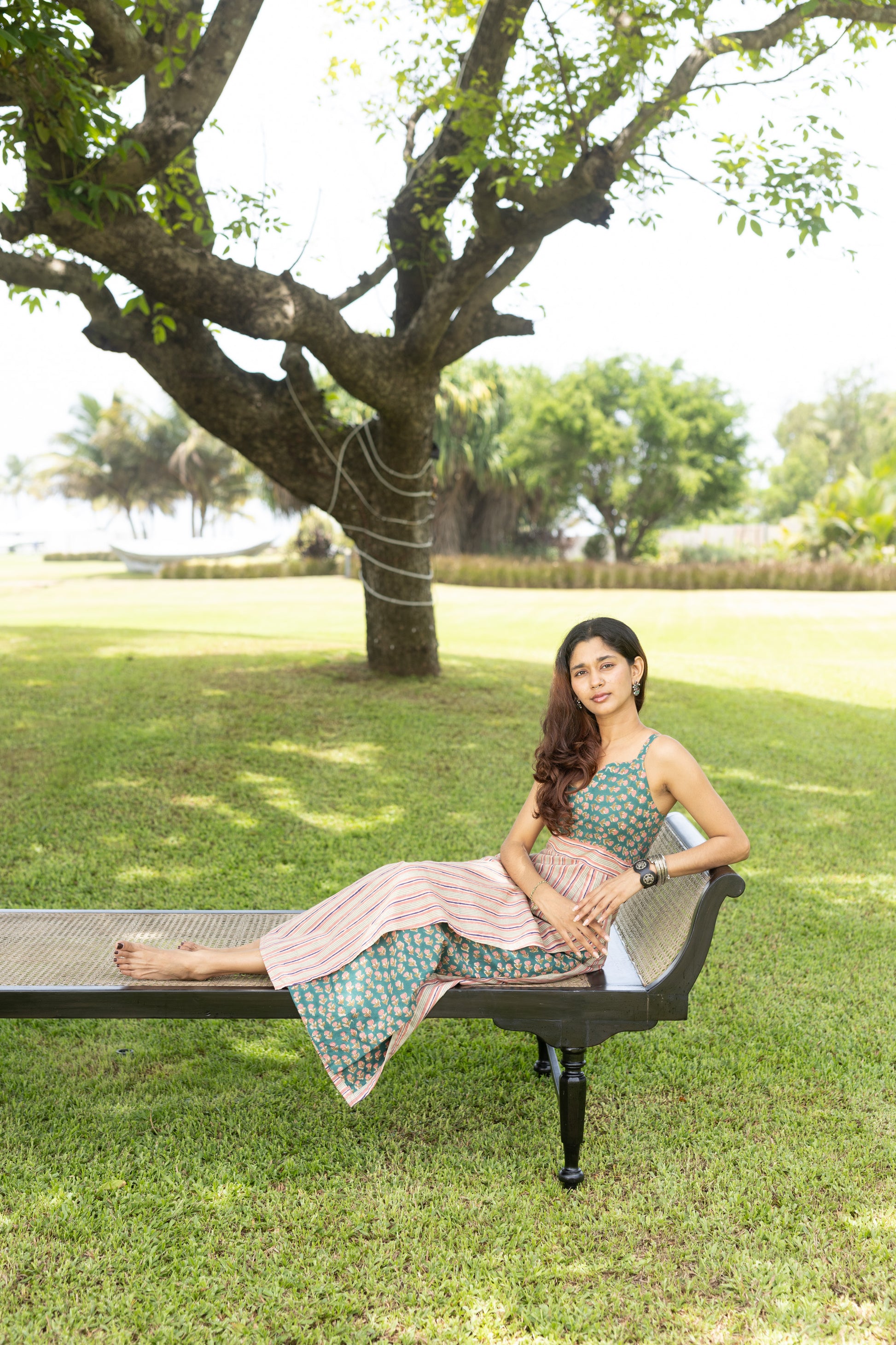 Fernlight is a story written in cotton — a maxi-length dress that feels like a pause in time. The bodice, in a quiet sage green, is scalloped and shaped to flatter gently, like foliage framing a garden path. Below it falls a skirt in long, fluid panels of blush pink and misty grey, striped like rain-soaked stone and faded petals. The illusion of layering adds depth, while the full length and breathable fabric make it endlessly wearable.