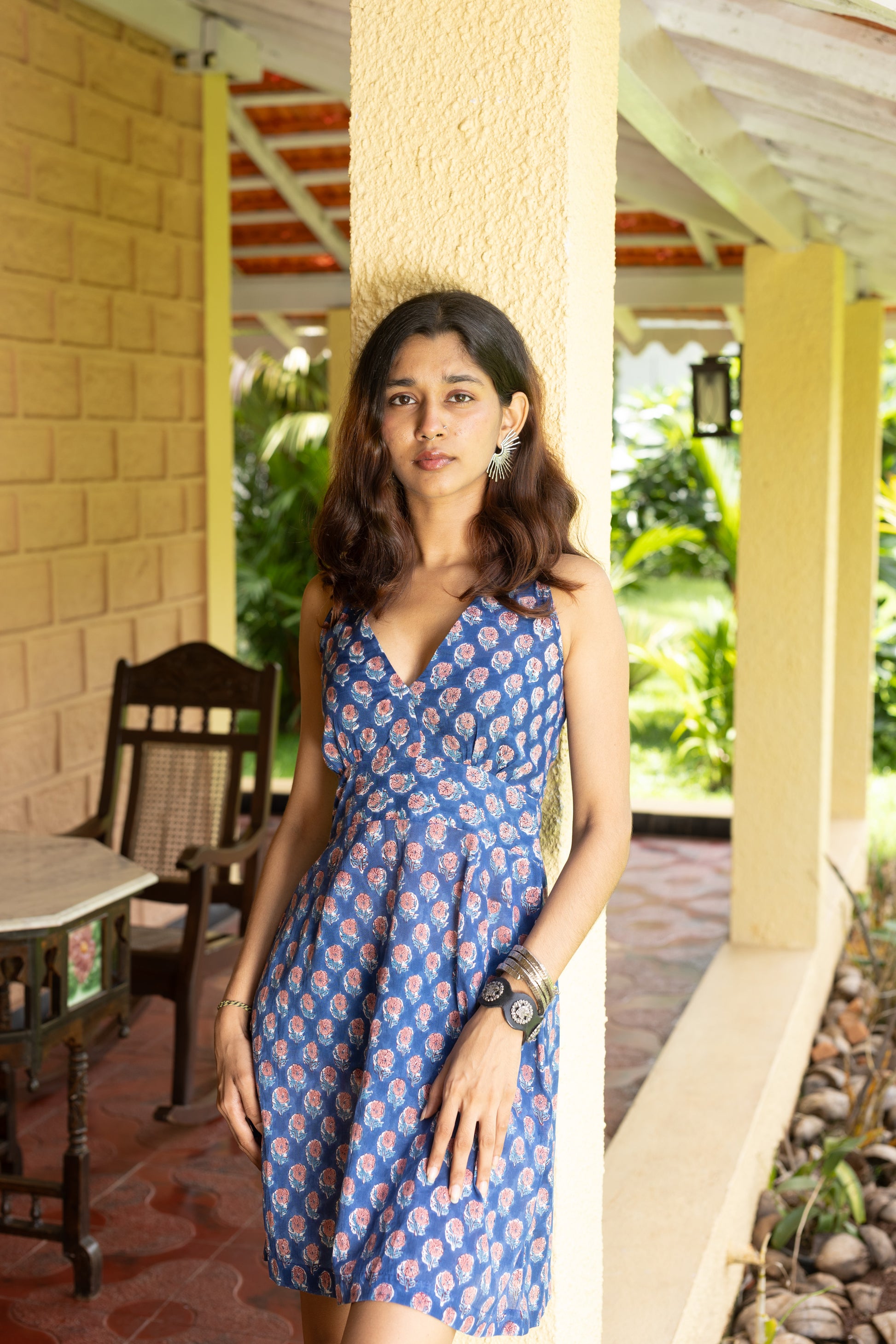 Gulnar Bloom is a celebration of quiet elegance and botanical beauty. Crafted in soft, breathable cotton, this sleeveless dress features a dusky indigo base adorned with delicate hand-block floral motifs in hues of coral, blush, and ivory. The silhouette flatters with a gently cinched waist and a relaxed flare that moves with ease, making it your go-to for balmy days and barefoot evenings.