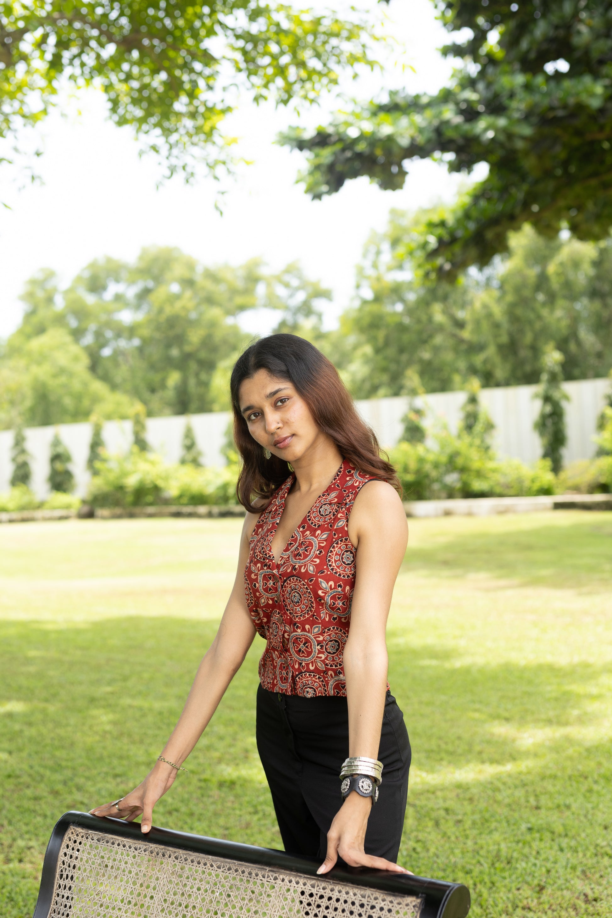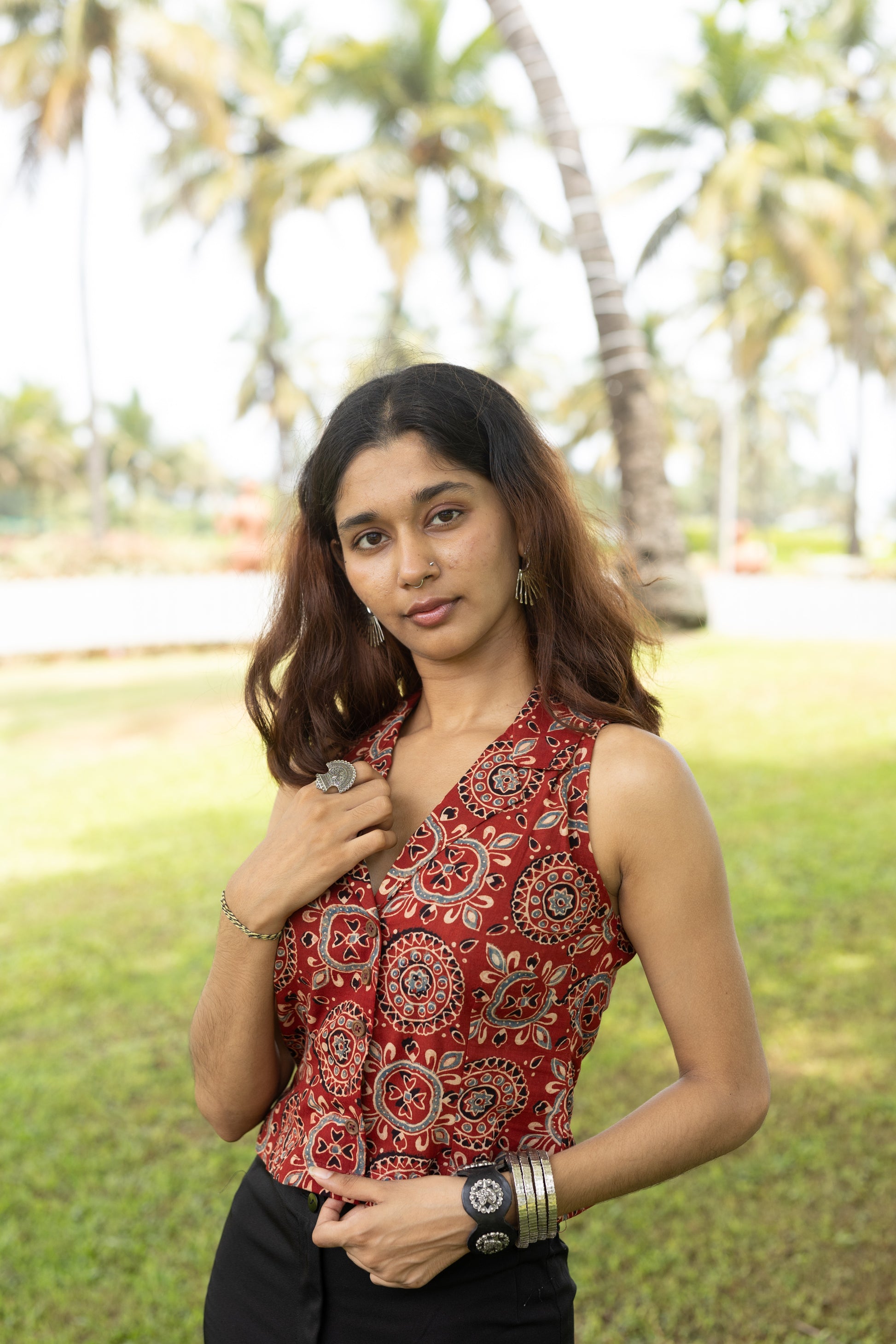 Raw. Refined. Rooted. Mitti Sauvage is a waistcoat that feels like it was carved from the land itself — sunbaked rust cotton, dense in weave, rich in texture, and firm in intent. The silhouette is sharply tailored: sleeveless, with a flat collar, and a buttoned front that fastens neatly across the chest.