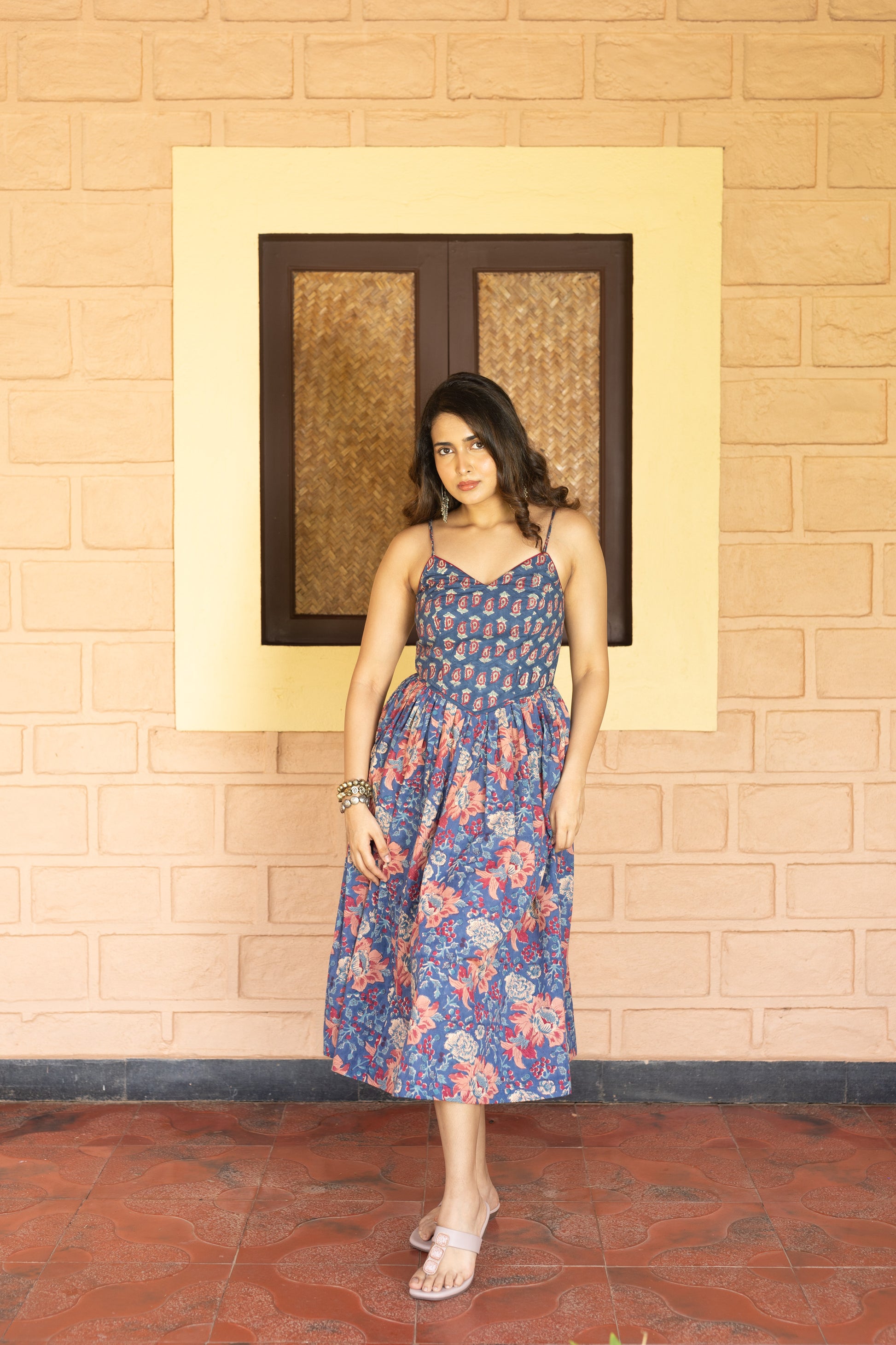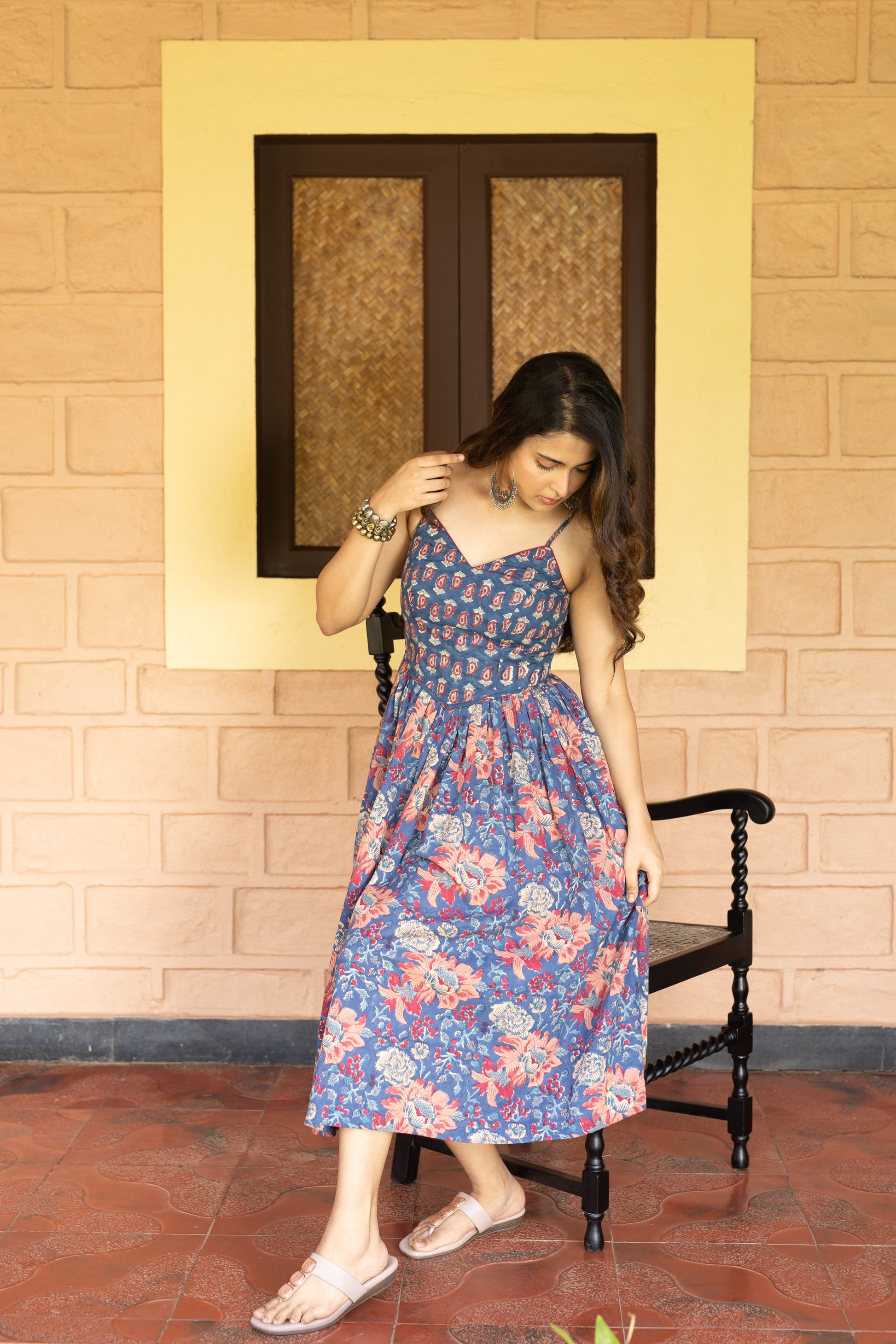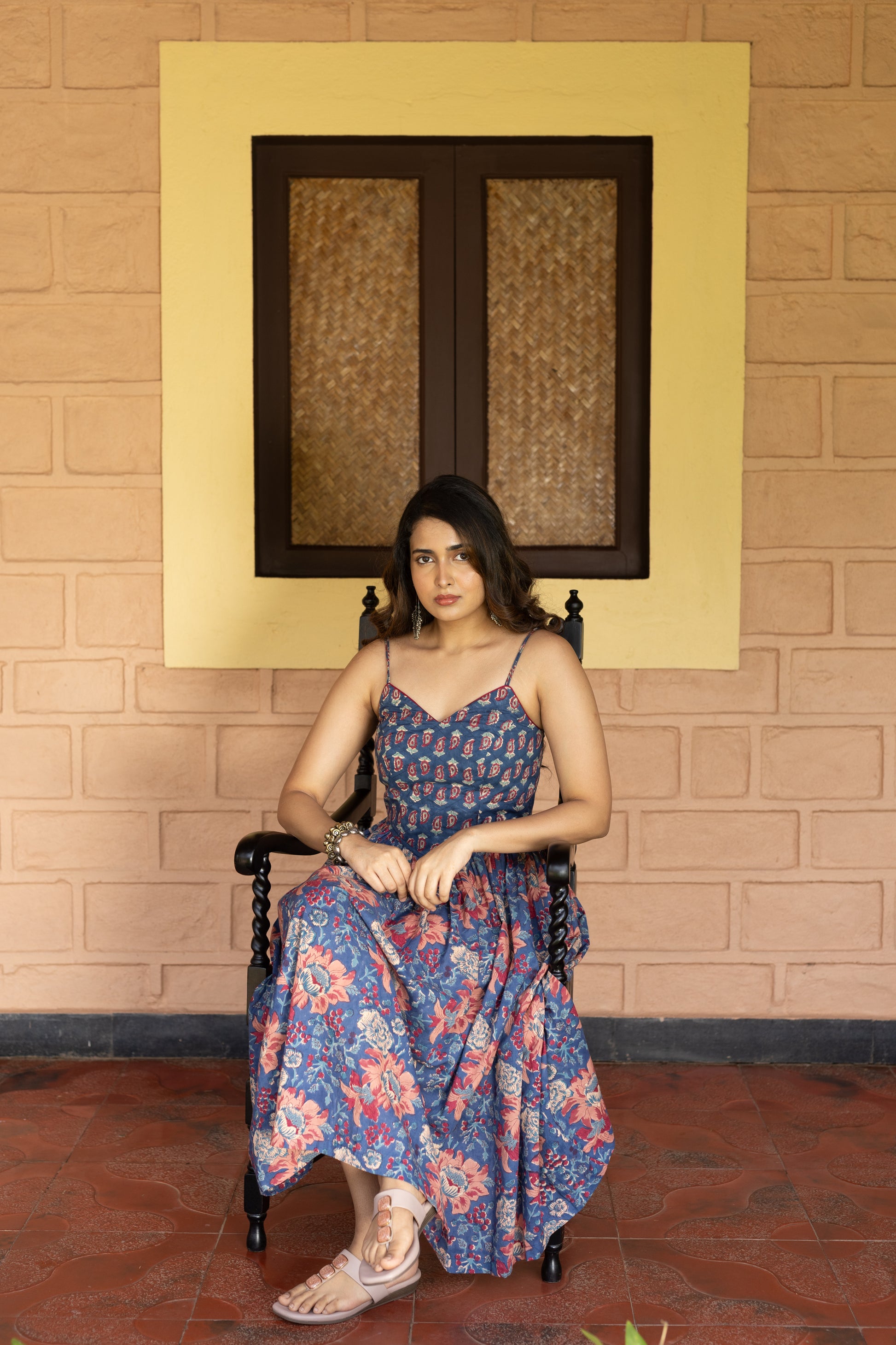 Noor Baagh captures that sense of nostalgia and serenity in motion. Made from airy cotton, this midi dress features a mix of hand-drawn floral and paisley prints in deep blue and ivory, echoing the patchwork beauty of a garden in full bloom. Spaghetti straps, a softly tiered skirt, and thoughtful tailoring make it effortlessly flattering — a piece to wear when the day is slow and the light is golden.